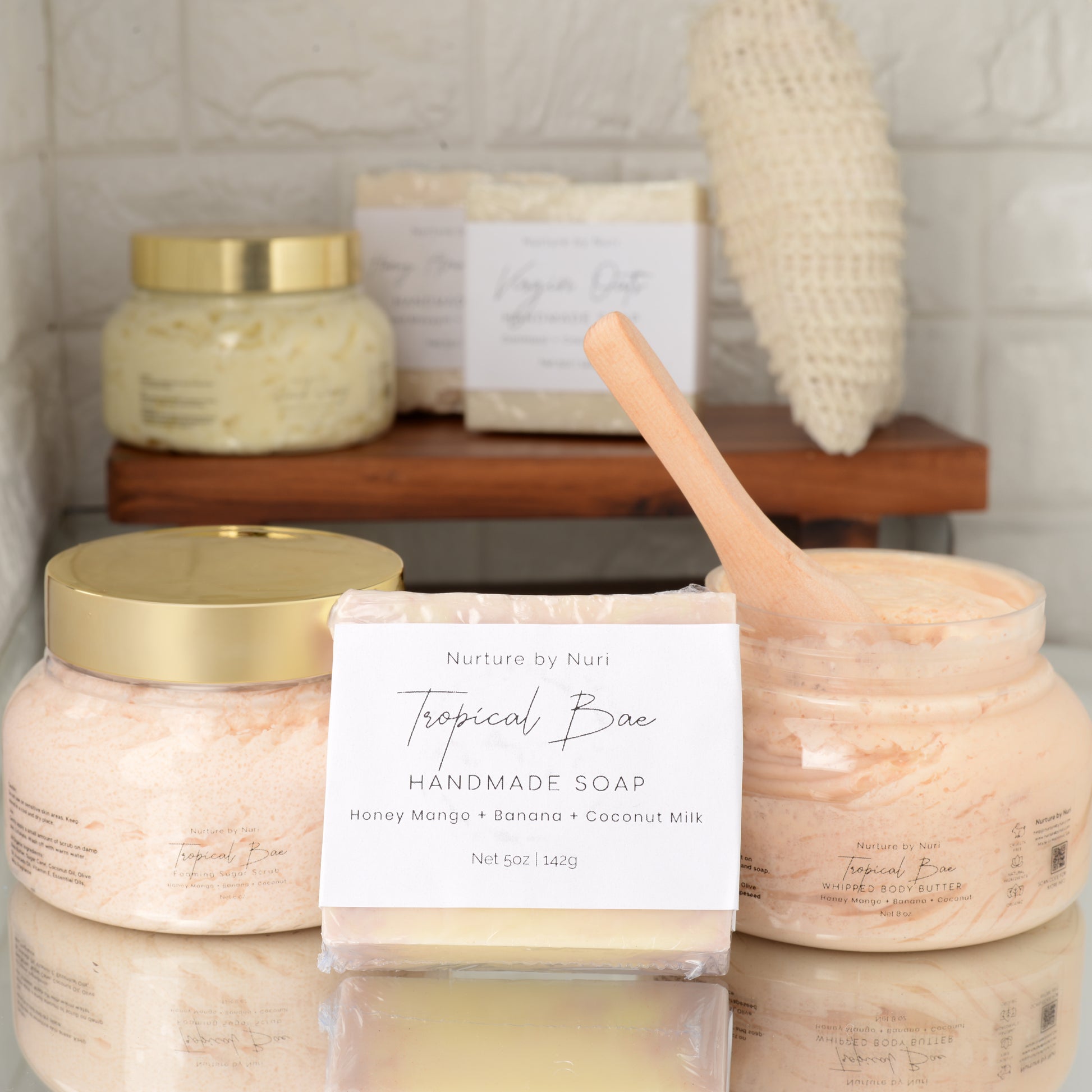 Indulge in a luxurious shower experience with "Tropical Bae" Whipped Sugar Scrub. This tropical-scented scrub combines natural oils and sugar to gently remove toxins and impurities from your skin, leaving you feeling refreshed and invigorated. Its fruity scent and luxurious lather will transport you to an exotic paradise with each use.